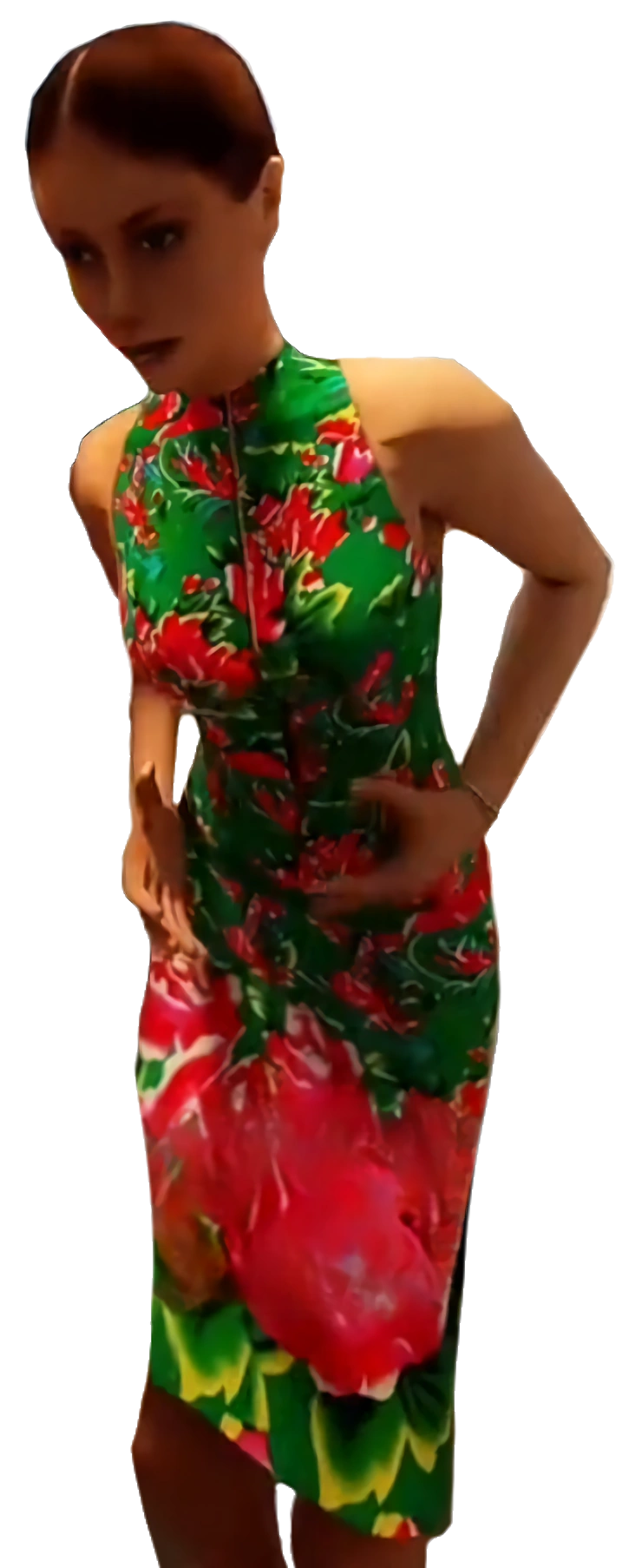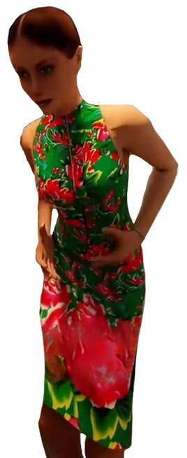 She has a brown hair, pale skin, a dress with a red and green flower print, and brown eyes.